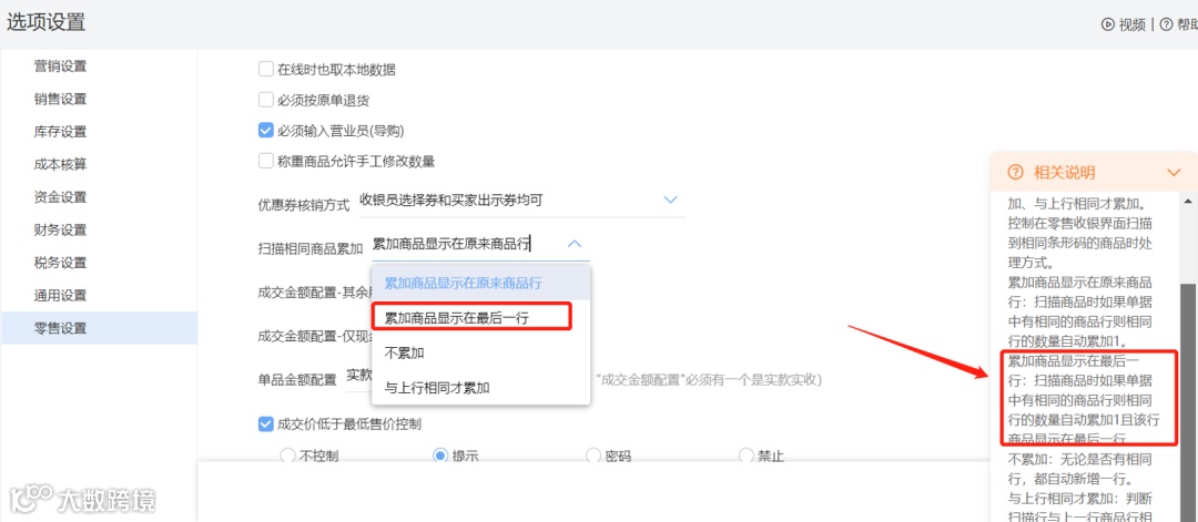 设置零售选项,功能入口:选项设置—零售设置—扫描相同商品累加