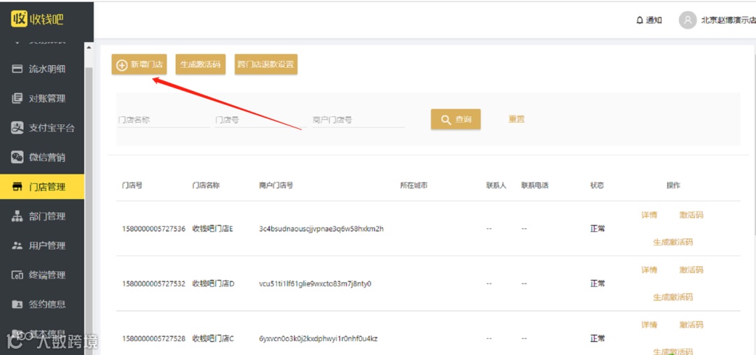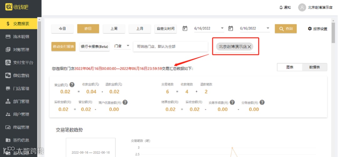这样,在「收钱吧」后台,就可以查看各门店的收款额及收款明细了。