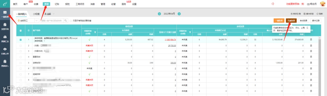 b、无盘取票,在客户资料维护好国税信息,点击无盘取票进行取票。目前支持上海、河北、江苏,更多地区即将开发。