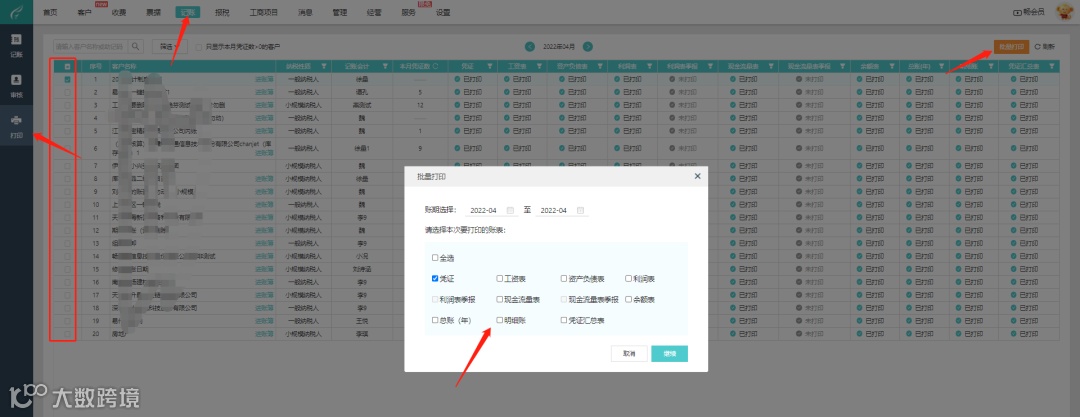 批量打印,可一次性打印账套凭证、账表数据,节省打印的操作步骤。