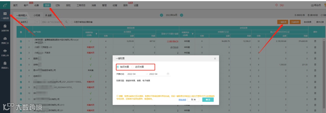 a、一键取票,点击【票据】-【一键取票】-勾选【客户】-【批量取销项进项发票】(请下载取票机器人客户端,安装运行客户端并连接税盘,并输入税盘密码)