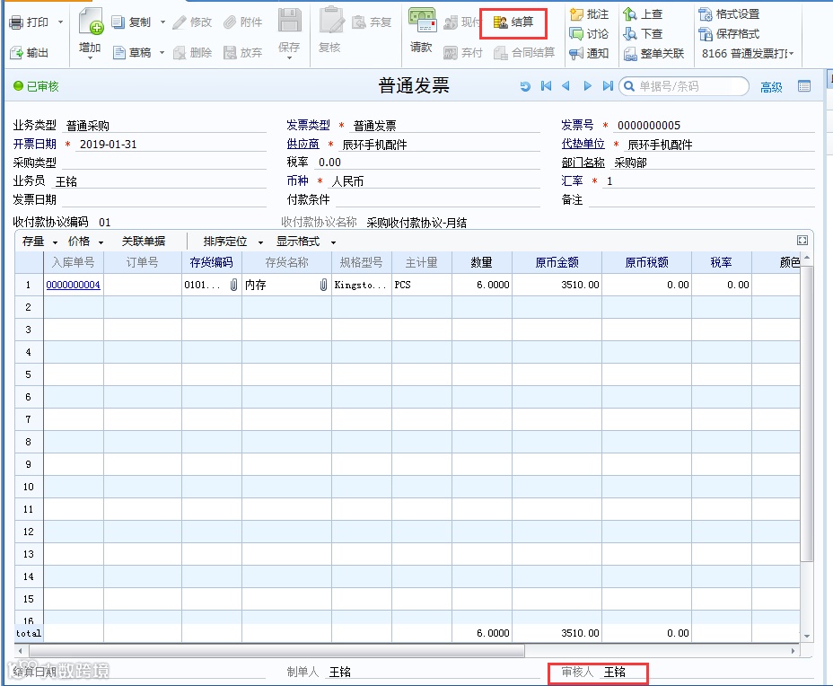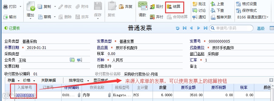 在发票上点击“结算”的快捷按钮,实际上是入库单和发票结算,那么发票必须是来源入库单,否则系统无法辨别这张发票是与哪张入库单结算!