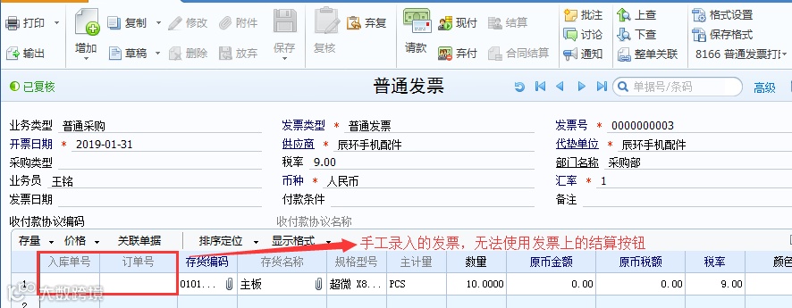 手工录入或参照订单做的发票,无法使用发票上的结算,此发票只能在【采购结算】-【手工结算】中勾选入库单和发票做手工结算;