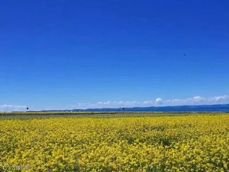 在晴天下,远处是蓝色的湖水,近处是似海的黄色天堂,一片片齐刷刷、金灿灿、黄嫩嫩的油菜花像展开的一幅巨大的黄色地毯,一直铺到青海湖边,黄色和蓝色交织在一起,形成了一个彩色的世界。
