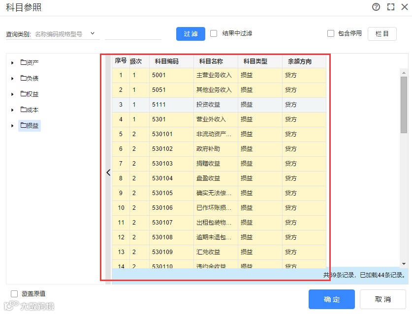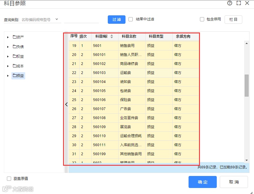 如果费用类科目太多,但是在一个区间内都属于费用类科目,此时可以选中排序为第一个的费用类科目,然后拖动滚动条至最后一个费用类科目,按住键盘的SHIFT键后选中最后一个科目,可以实现一次性选中区间内全部科目,最后点击【确定】进行查询。