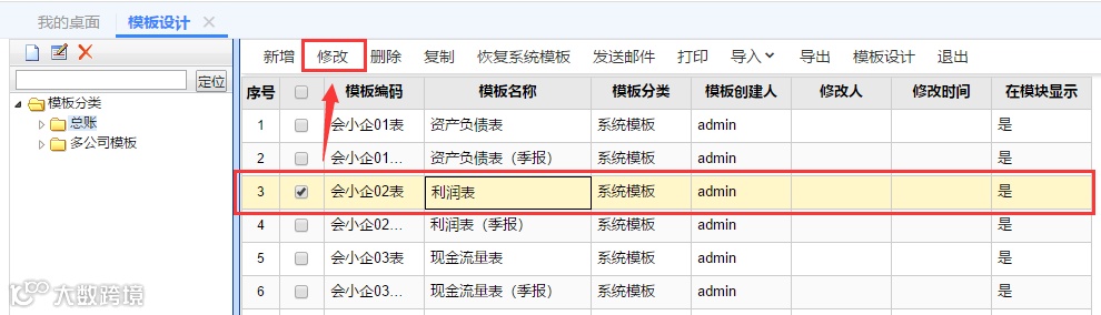 第2步:确认取值错误科目后,依次点击【T-UFO】-【模板设计】,选择【利润表】点击修改。