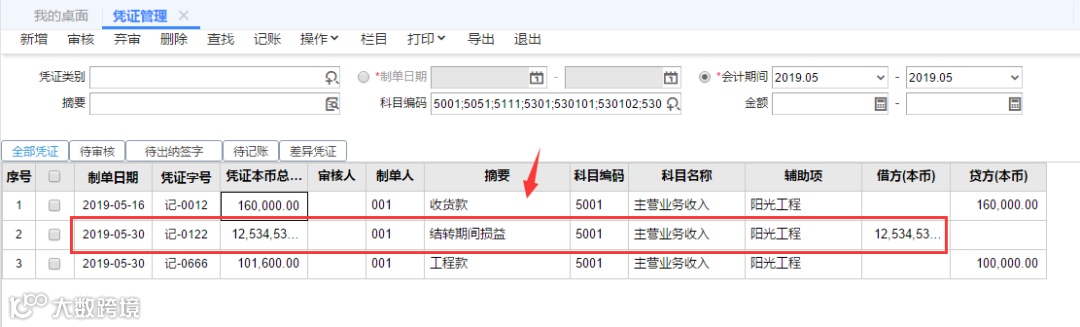 第1步:查看凭证是否有进行期间损益结转,且期间损益结转后的凭证是否已记账。
