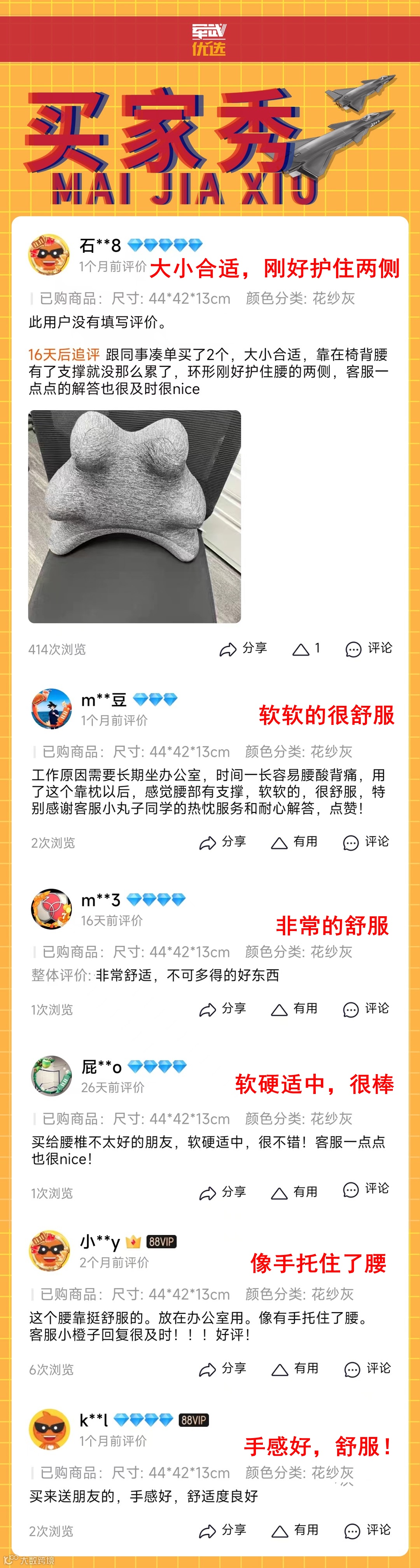 推荐理由:对于上班常坐在工位上的人来说,坐如钟,保持饱满和稳定的工作状态是我们必备的素质。而且小编在工作之外也会经常开车出门,为了安全,也需要保持一个姿势。但久而久之腰酸背痛的问题也就随之而来。有时候真的疼痛难忍,感觉整个人已经失去动力了!于是我无意中和其他部门同事聊天时候的借坐他邻座同事的椅子正好有个护腰腰靠。当时感觉就像有人在后面“抱住我”,真的很舒服,毕竟这外形就像个“人”。后来问了这个同事也给自己买了一个,现在上班开车都带着它,越靠越舒服,现在腰酸背痛也都消失了,确实不错!