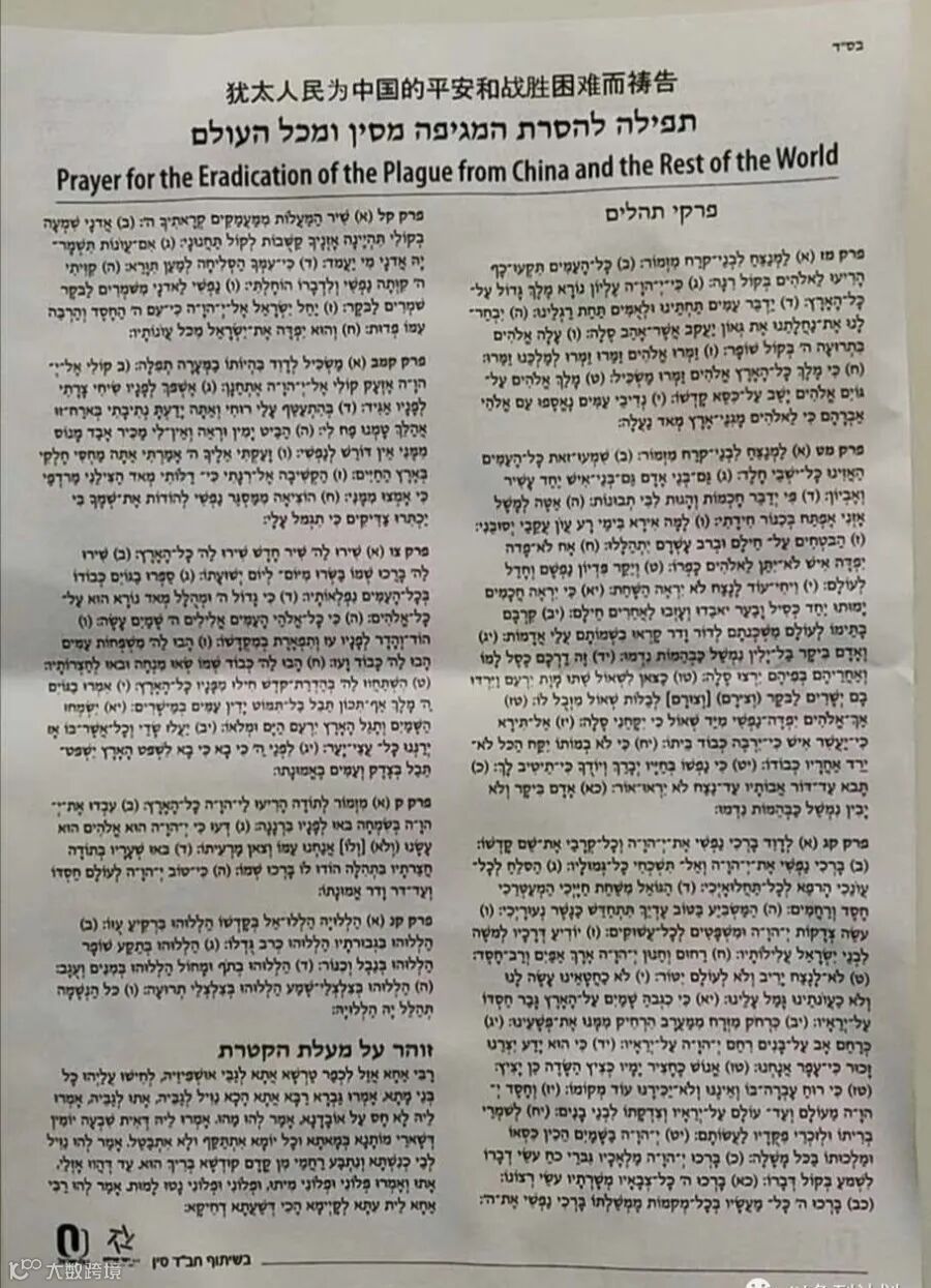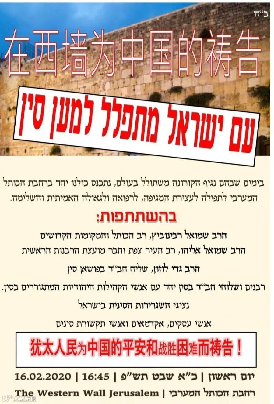 迦底拉比有晚睡的习惯,这次他睡得更晚,他在考虑如何来邀请更多人来加入此次祈祷,因为第二天就是安息日,而在安息日这一天许多以色列的传统人士都会关机在家并中断与外界的联系。于是他打电话给正在上海的笔者,那时已是耶路撒冷时间凌晨4点,北京时间周五上午10点。他说希望我一起参与组织和准备,说我虽然远在上海,但还是可以在以色列进行宣传动员,我觉得此事很有意义,而且对中国也很有裨益,于是爽快地答应了。我不是犹太教徒,所以我可以在安息日做一些事情。到了周五的下午拉比们给两天后的祈祷活动定了一个主题:עם ישראל מתפלל למען סין,希伯来语的字面意思是:以色列人为中国祷告,我把中文定为:“犹太人民为中国的平安和战胜困难而祷告”,与原文意思相同,但意义更广。以色列人和犹太人虽然有区别,但笔者也希望全球犹太人都来支持中国,毕竟参与者有以色列拉比也有长期客居中国和欧美的拉比。活动是为中国祈祷,更是为中国的平安和战胜疫情困难祈祷。拉比对这个中文表述表示同意,于是立即将这个通知发送给亲朋好友们。