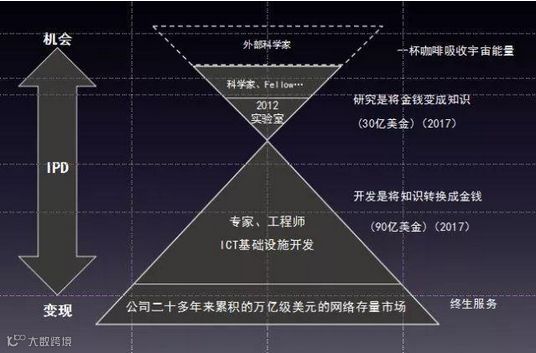 这个图代表着华为今天和未来的研发结构,上面的小三角,是将金钱变为知识的过程,虚线部分主要是跟全球大学、研究机构同方向的外部科学家进行合作。