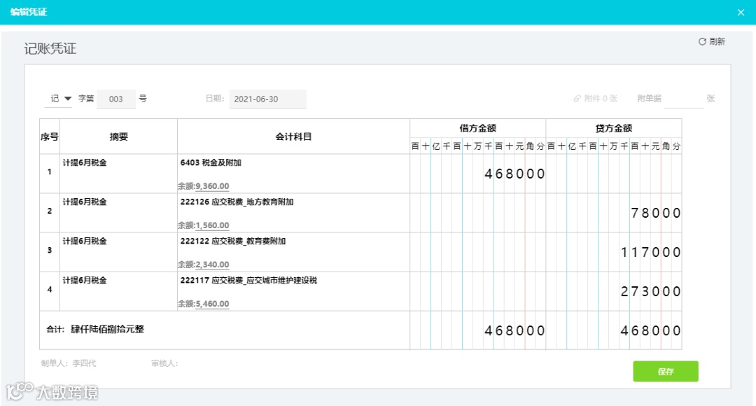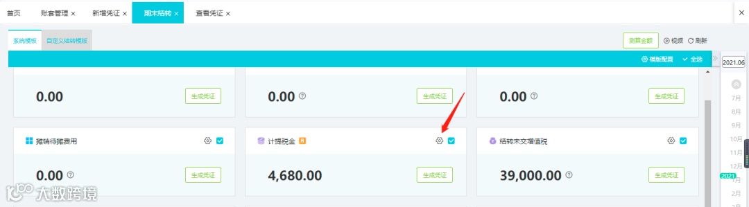 ③在期末时,进结账-期末结转,设置好计提税金相关规则点右上角“测算金额”后,系统自动计提本月的税金如下: