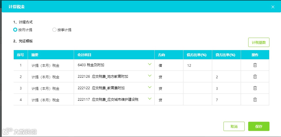 <2>小规模纳税人可以按季度计提附加税金,计提基数为每季度的应交税费-应交增值税,计提的税率可以根据当地税局要求设置,通常情况税率为:城市建设维护费7%或者5%,教育费附加3%,地方教育费附加2%。