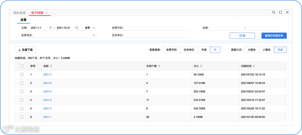 支持电子发票PDF、OFD两种格式电子文件归档及档案查询。