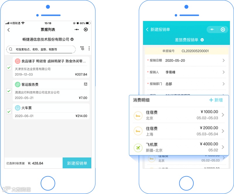 支持报销单根据票据智能生成,报销事项、报销金额、费用明细无需录入。票据自动挂接在报销单上,电子发票一键提交给财务。