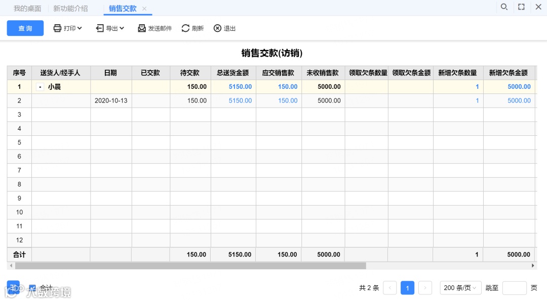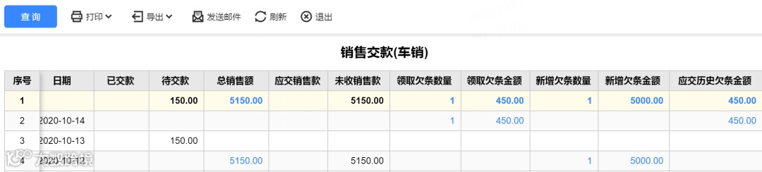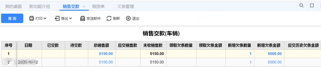 1、财务查询交款业务员的销售交款表,除应交款外,可以查到应上交的欠条数、金额、领取的欠条数和金额等信息;