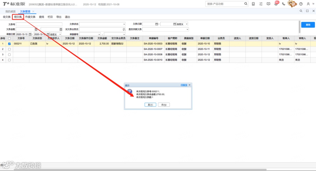 若业务员离开公司时向财务领取了欠条,也可以在领取欠条信息中查看;