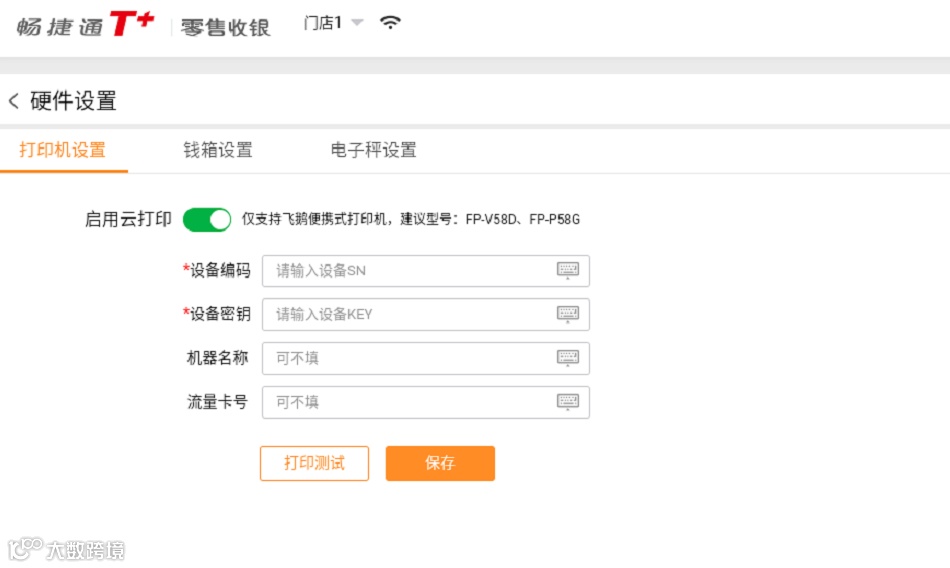 小贴士:打印机上贴有设备编码及密钥,查看后在设备编码及设备密钥处录入即可。