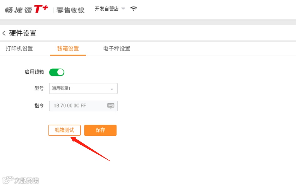 在钱箱设置处列示有常用型号;建议按顺序选择并进行测试,测试成功后,保存即可。