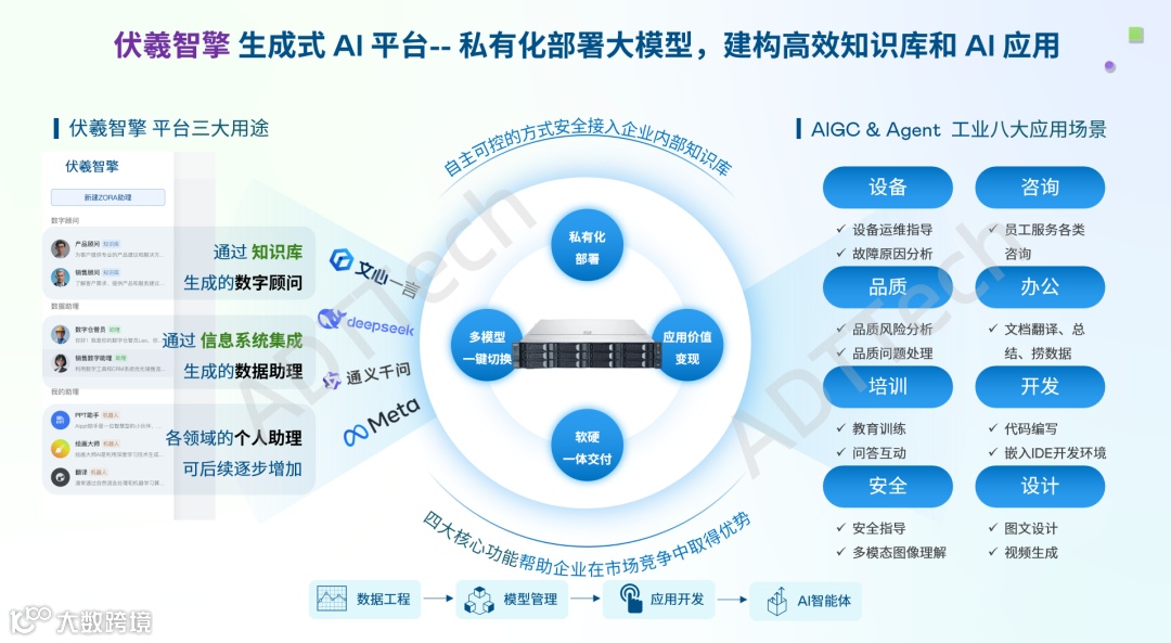 伏羲智擎(Lean AIGC)作为 ADTTech Lean AI 伏羲工业 AI 平台的三大核心模块之一,是专为制造业打造的生成式 AI 平台。它聚焦工业知识沉淀、业务数据智能解析与场景化 AI 应用快速生成,把知识变成企业可调用、可生长、可传承的资产——并以“数字顾问、数据助理、个人助理”等 AI Agent 形态,无缝融入每个人的工作流程。