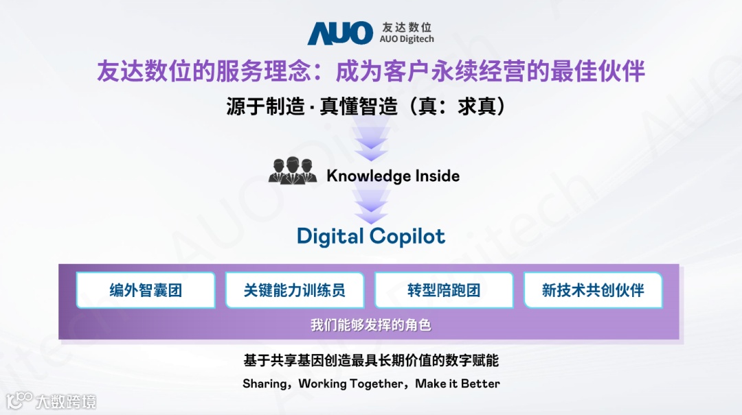 在追求卓越技术创新的同时,友达数位也将企业的可持续发展视为重要使命。为此,公司特别设立了企业可持续发展研究院,该研究院秉持共享、共创、共学的理念,通过三大知识服务赋能模式,汇聚顶尖专家资源与丰富的数字化转型实战经验,为企业提供量身定制的知识服务与技术支撑,助力企业实现绿色、低碳、可持续的发展目标。