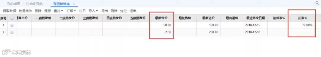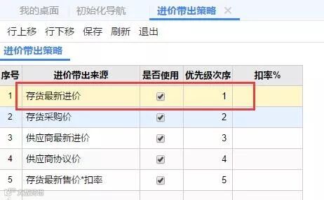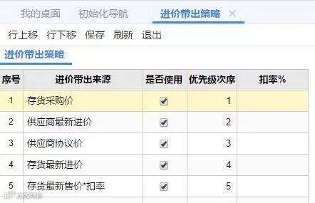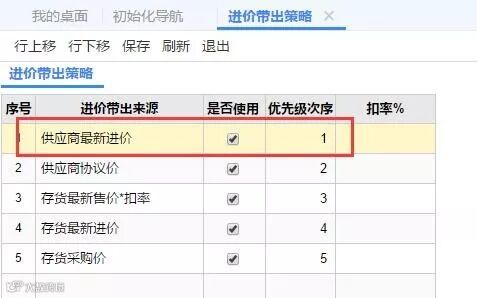 1、 在进价带出策略中,将存货最新售价*扣率设置为最高优先级。
