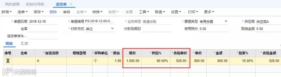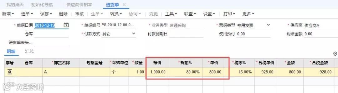 3、后续做采购单据时,自动从最近一张立账单据上取“报价、折扣、单价/含税单价”带入到当前单据对应的字段中。
