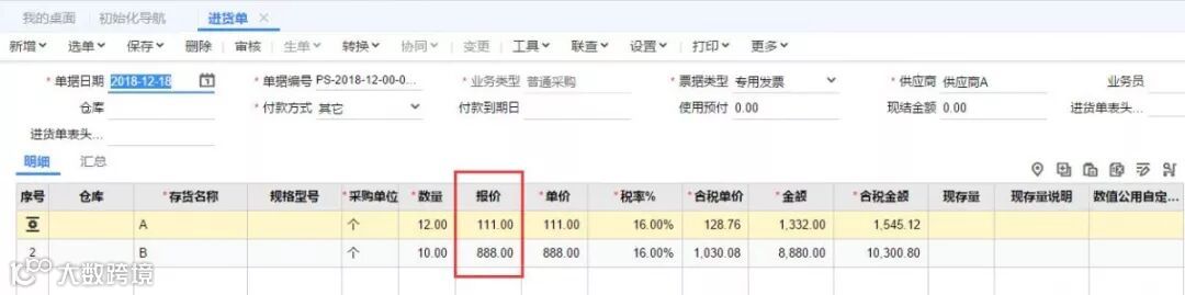 A:可使用供应商最新进价,自动从立账单据上取“报价、折扣、单价/含税单价”带入到当前单据对应字段中。