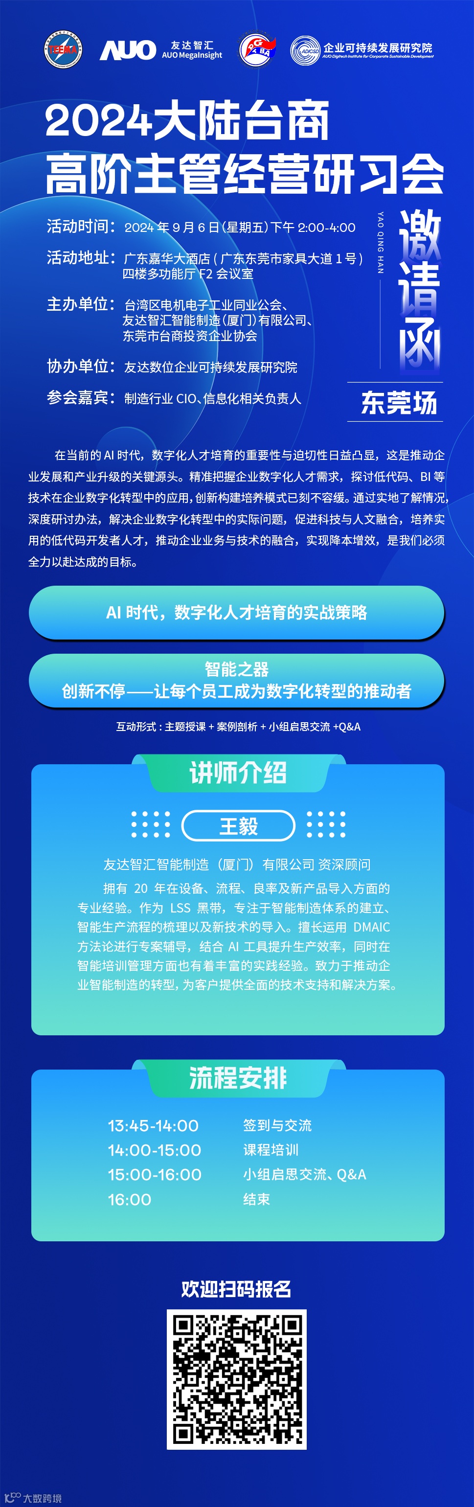 展会同期,友达数位旗下子公司友达智汇智能制造(厦门)有限公司将联合电电公会、东莞市台商投资企业协会、友达数位企业可持续发展研究院于 9 月 6 日共同举办“2024 大陆台商高阶主管经营研习会”。