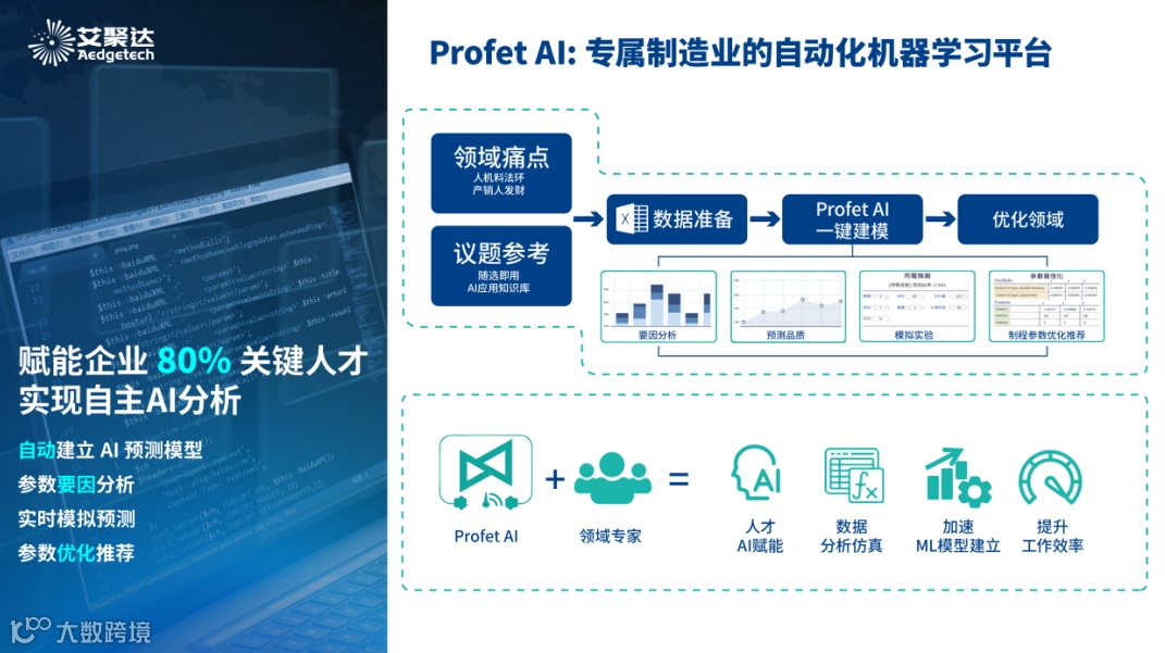 Profet AI 聚焦 “结构化数据的预测式分析”,能够构建高维度数据分析挖掘能力,快速找到制程中的关键问题,生产过程中的趋势规律,实现品质预测、失效分析和参数推荐,通过优化工艺参数,提高产品质量。