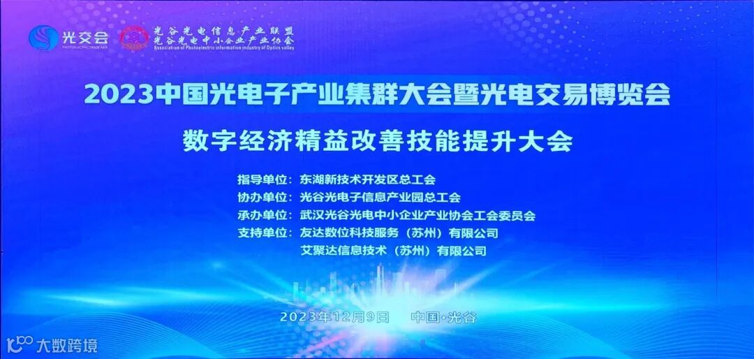 12 月 9 日,光交会重要活动之一“数字经济精益改善技能改善大会”于武汉光谷隆重举行。大会由东湖新技术开发区总工会指导、光谷光电子信息产业园总工会协办、武汉光谷光电中小企业产业协会工会委员会承办、友达数位科技服务(苏州)有限公司及艾聚达信息技术(苏州)有限公司支持。