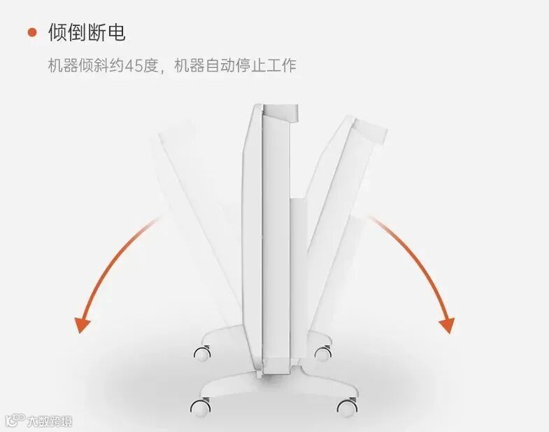 电暖器发生倾斜也不用担心,假如倾斜约45度,机器就会自动断电。