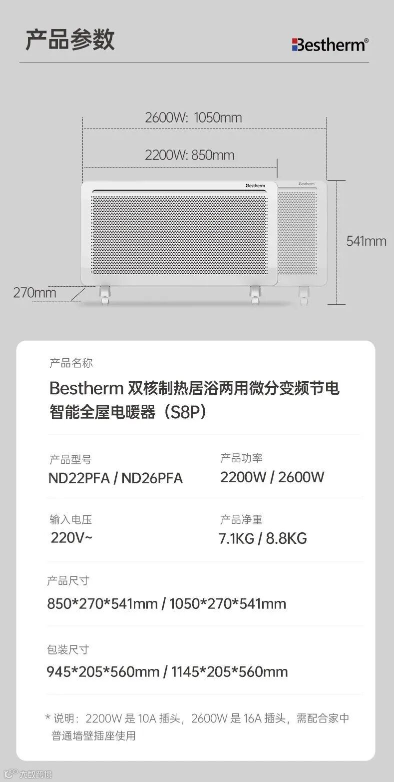 今年Bestherm的这款双核制热居浴两用微分节电智能全屋电暖器有两种规格:2200W款和2600W款。