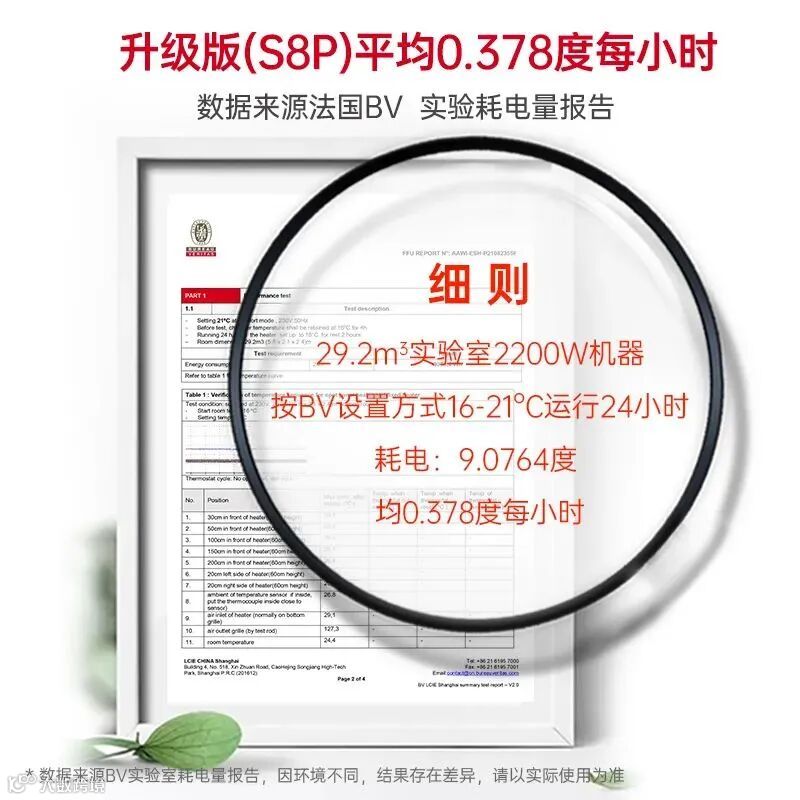 据法国BV测试机构报告显示,2200W机器在29.2立方米的房间使用24小时,环境温16℃,设置21℃。