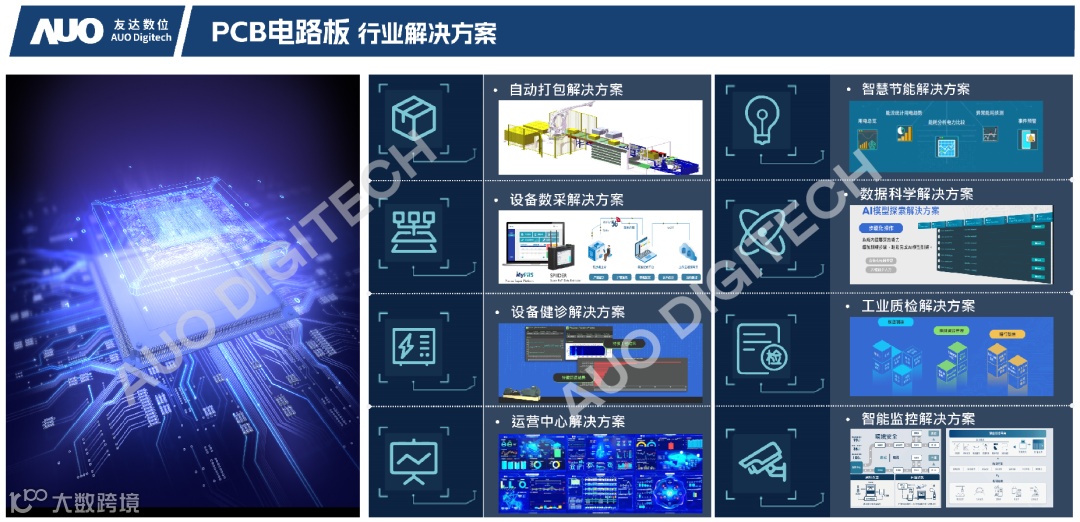 2023 年,友达数位致力于细分行业领域的深耕, 而 PCB 正是其中重要的拓展产业之一。友达数位携艾聚达、友达智汇,基于设备数采、工业质检、智慧节能、智能监控等应用整合出了一套完整的 PCB 电路板行业解决方案,旨在为 PCB 企业提供更聚焦、更专业、多元化的智能制造和数字化转型服务。
