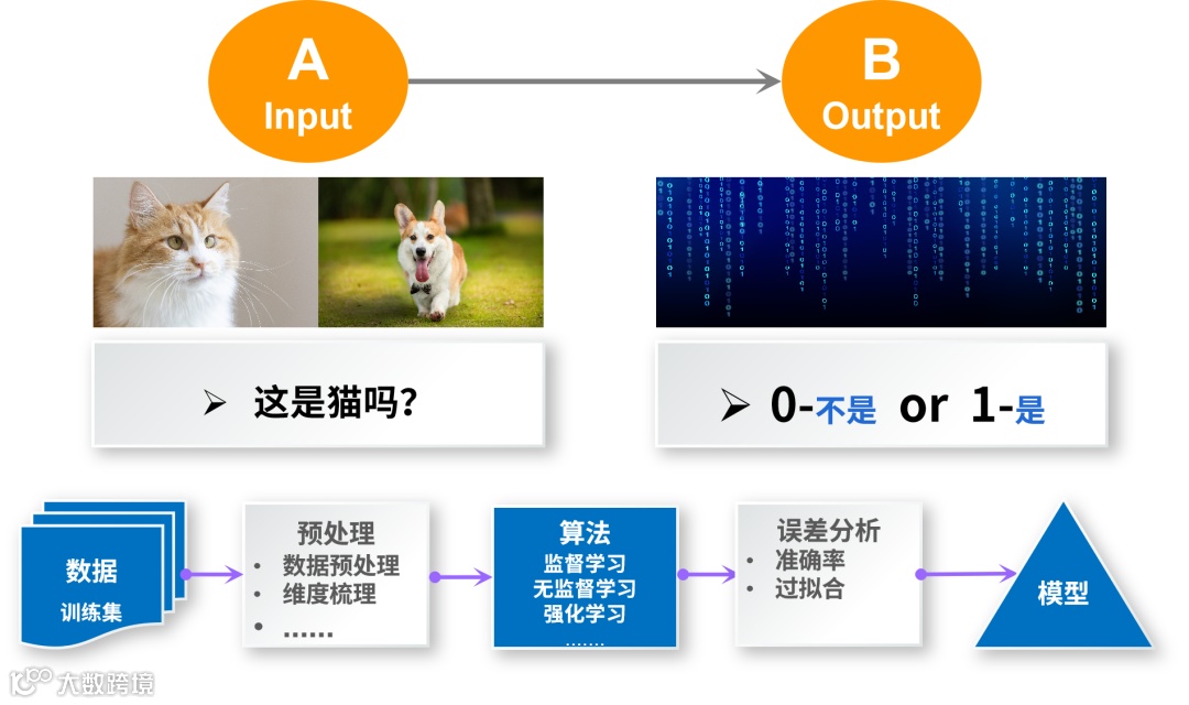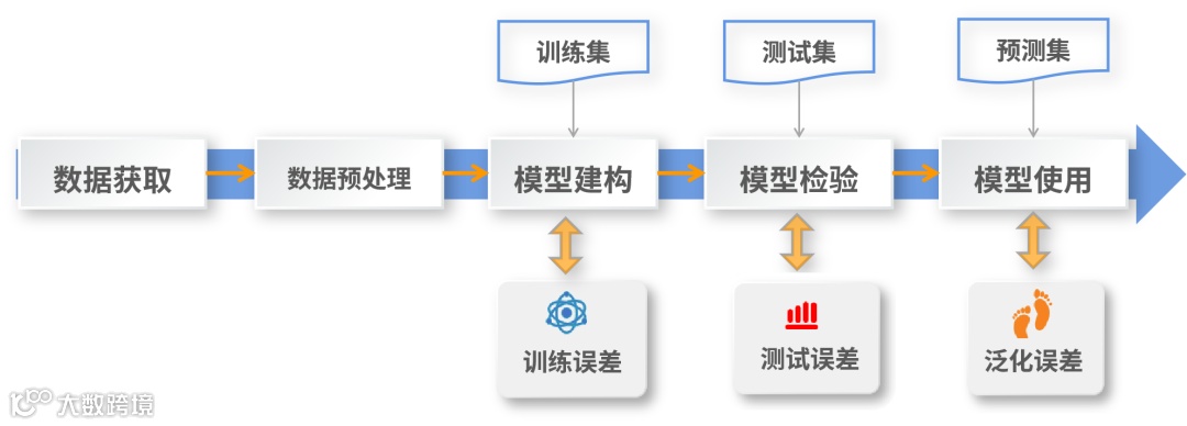 整个过程共分了五个步骤,从收集数据 - 数据预处理 - 算法学习 - 误差分析 - 模型产出,其中最重要的三要素:数据、算法、模型。
