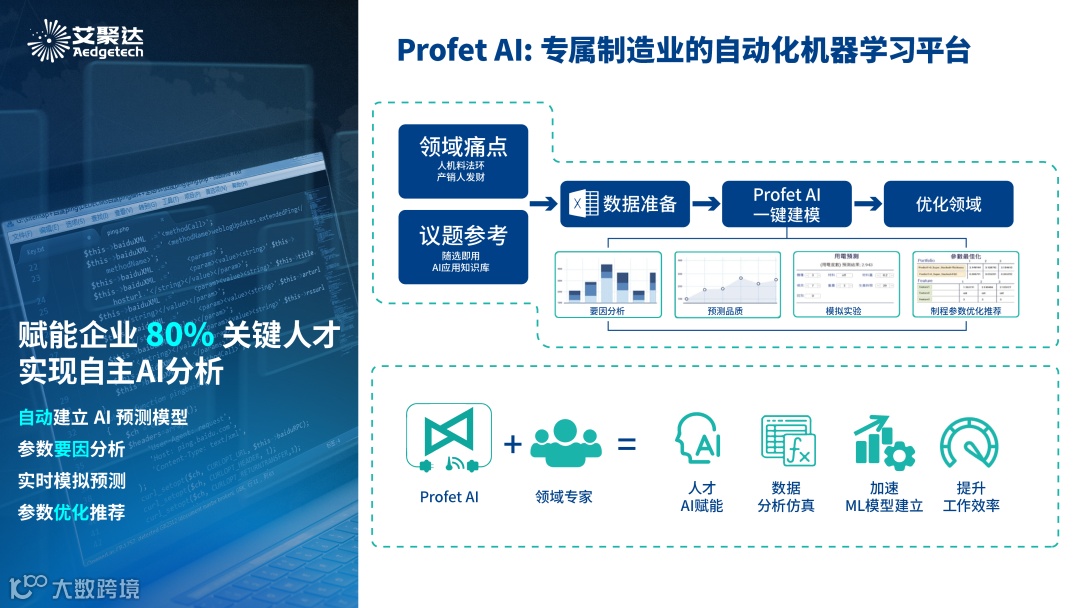AI 数据分析技能的普及化,将为企业带来全面竞争力提升。艾聚达 Profet AI 是自动 AI 机器学习平台,通过无代码来实现机器学习。一天上手,一周落地,能够赋能企业 80% 关键人才实现自主 AI 分析。如需了解关于 Profet AI 的资讯,欢迎您致电 400-1093-688 与我们联系。