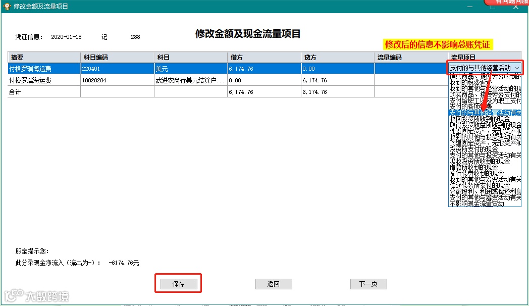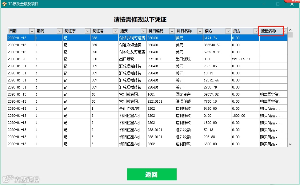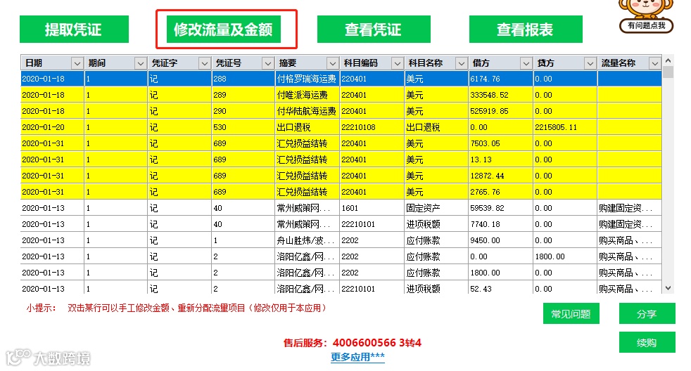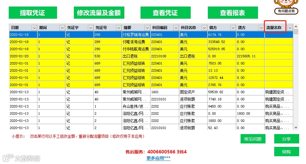第三步:提取完毕后,点击流量名称列头,使数据排序,会看到有标黄的数据没有分配流量项目,一般这种都是新增的科目,或者多借多贷,凭证不规范,没有办法确认流量项目,需要手动去分配。