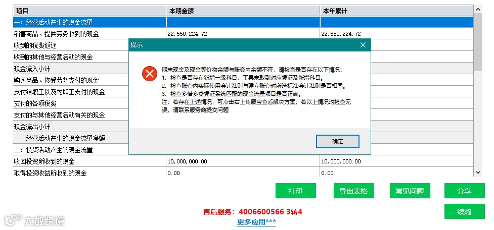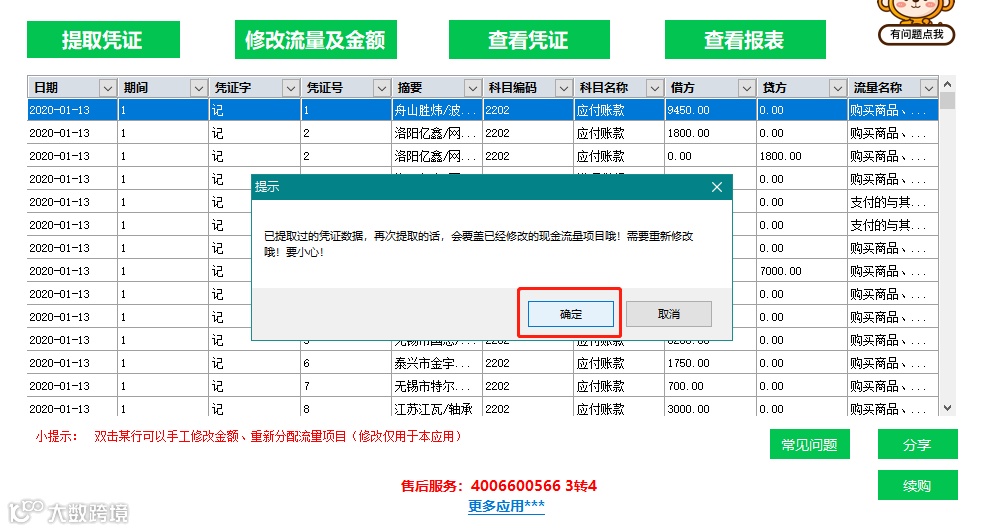 第二步:点击确认,重新提取(点击确定后会从账套库中重新取数,故会覆盖掉之前修改的数据,未分配流量项目的科目还需再分配一遍,点取消则不会从账套中重新取数,取的还是工具中之前修改后的数据。请根据实际情况选择【确定】【取消】)