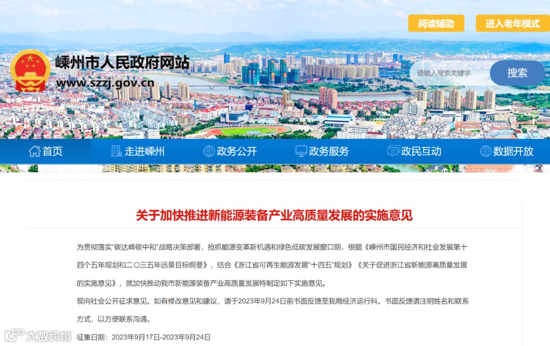 9月17日,嵊州市人民政府发布《关于加快推进新能源装备产业高