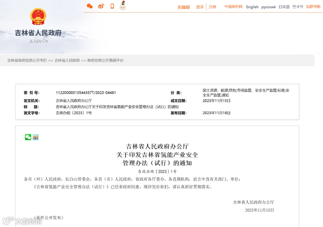 11月18日,吉林省人民政府办公厅发布关于印发吉林省氢能产业安全管理办法(试行)的通知。文件明确,电解水制氢(太阳能、风能等可再生能源)等绿氢生产项目及其制氢加氢一体站不需在化工园区内建设。绿氢生产不需取得危险化学品安全生产许可。