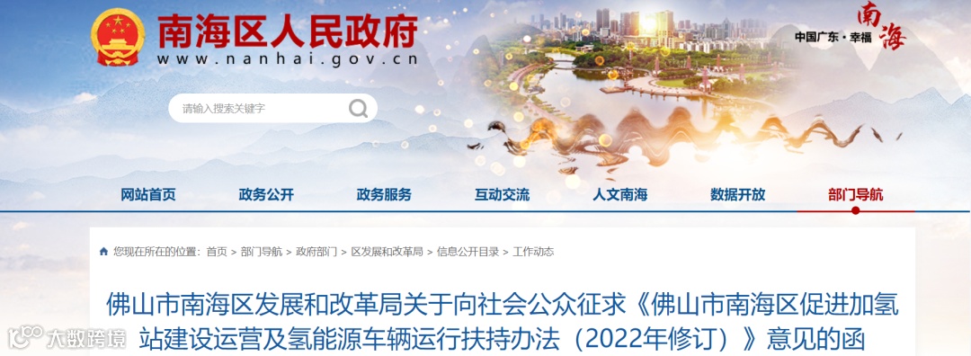 8月24日,佛山市南海区发改局发布了关于向社会公众征求《佛山市南海区促进加氢站建设运营及氢能源车辆运行扶持办法(2022年修订)》意见的函。