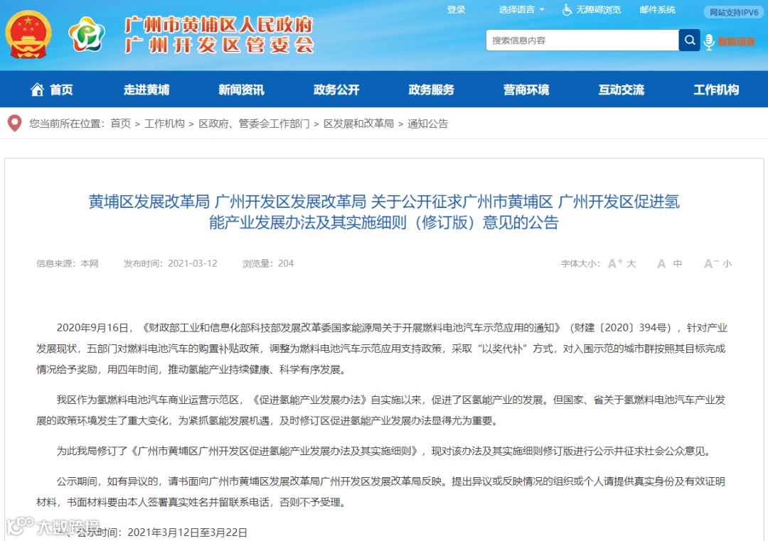 广州市黄埔区发展改革局、广州开发区发展改革局关于公开征求《广州市黄埔区广州开发区促进氢能产业发展办法及其实施细则(修订版)意见》的公告;
