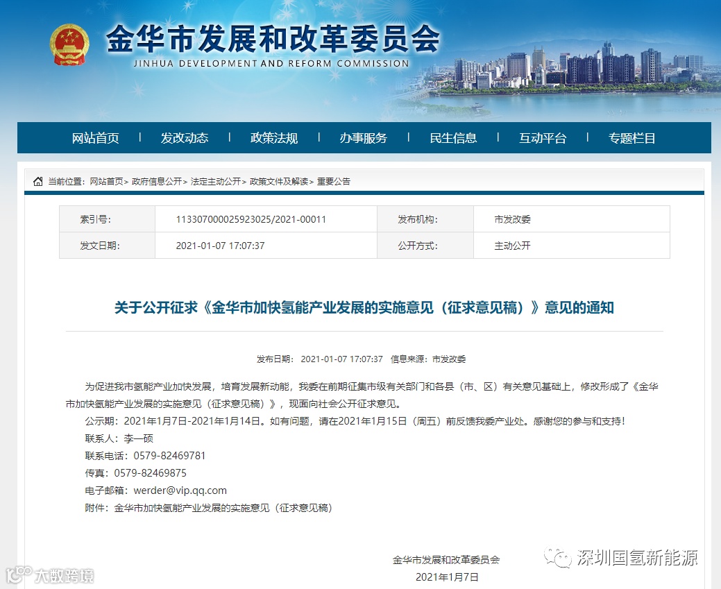 1月7日,浙江金华市发布“关于公开征求《金华市加快氢能产业发展的实施意见(征求意见稿)》意见的通知”。