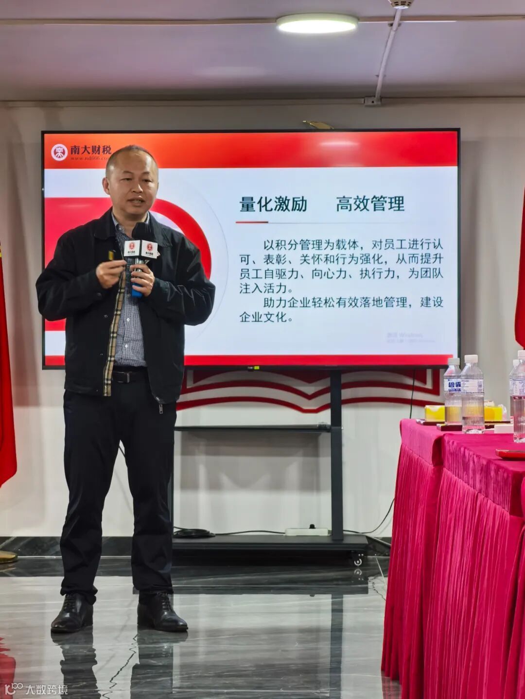 在分享企业管理制度的环节,黄董事长深入剖析了积分制管理在南大财税的成功实践。他指出,积分制管理能通过将大家的工作表现、学习成长、团队协作等方面量化成积分,并与福利等挂钩,构建了一套公平透明、激励相容的管理机制。