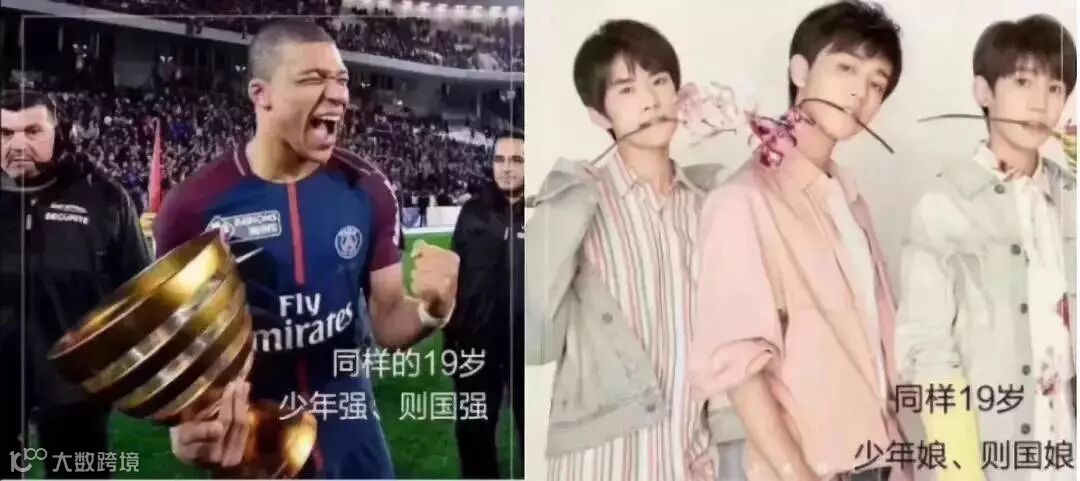 19岁独进两球的法国球员姆巴佩,和中国三个偶像明星。