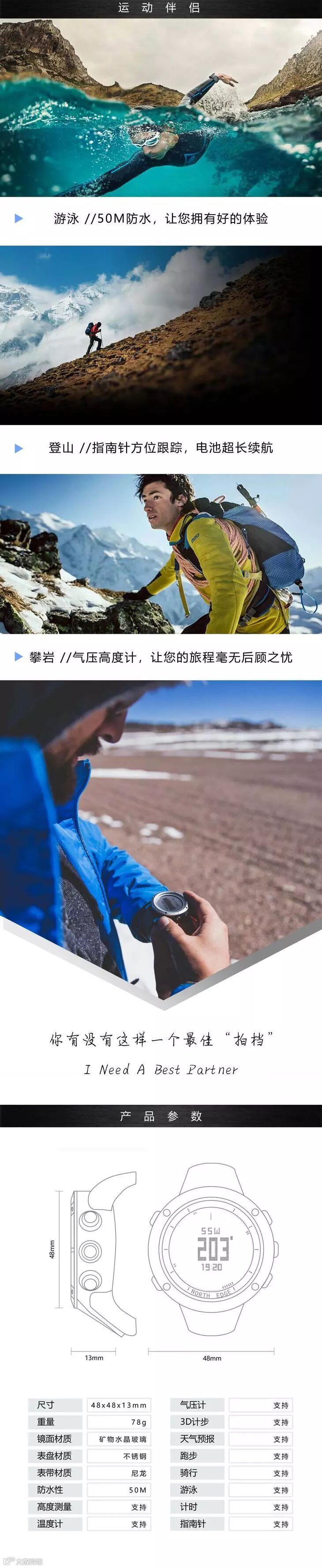 NORTH EDGE智能运动手表支持50米级防水,可佩带游泳。,尺寸为48x48x13mm,质量为78g,在运动环境下的抗摔打能力强,可以适应各类环境如:爬山、涉水、攀岩等运动模式。