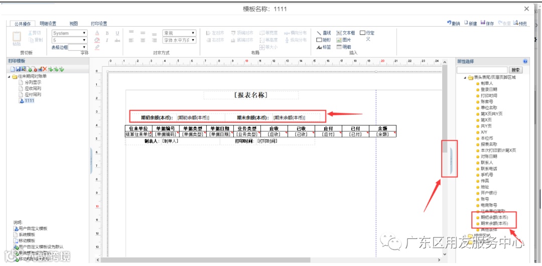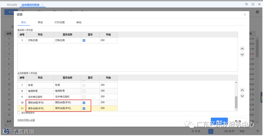 然后在打印模板设置里将所需要的表头字段显示出来,如期末余额(本币)字段。
