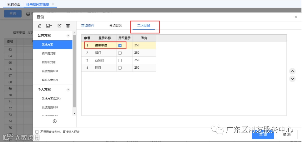 1、在查询往来期间对账单时,查询条件勾上表头二次过滤项,如往来单位进行查询;
