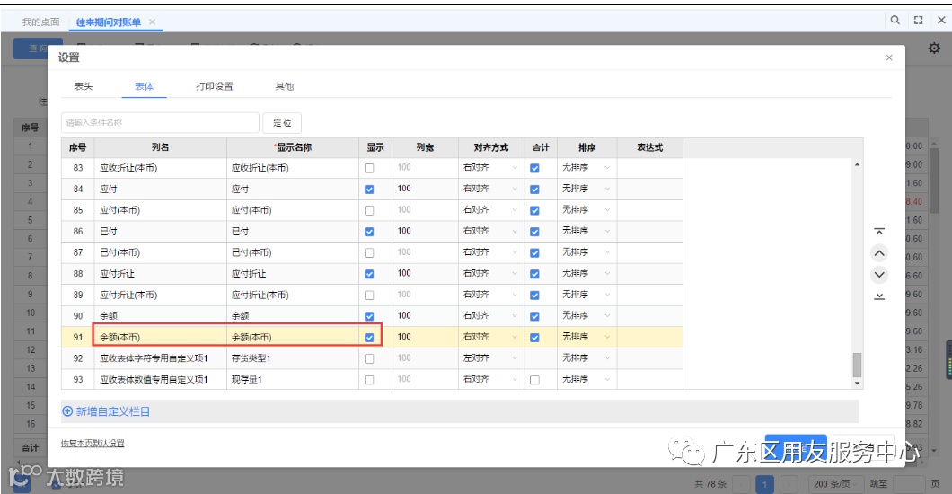 3、如果账套启用了多币种管理,需要再表体将以上信息的本币字段显示,才可以显示表头余额等字段,最后设置表头本币字段显示即可;