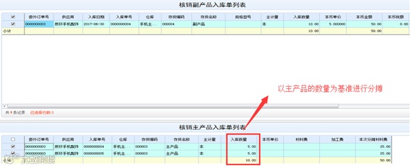 一张副产品入库单,可以对多张主产品入库单进行材料分摊。分摊时,以主产品入库单的入库数量为基准进行分摊。